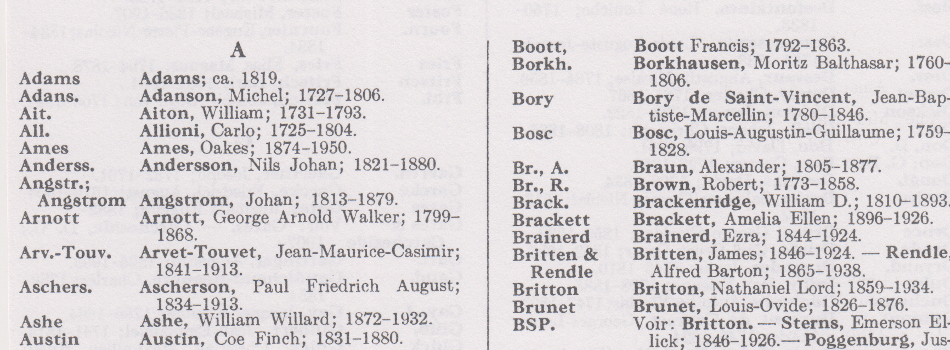 A - Adams, Andanson, Aiton, Allioni, Ames, Andersson, Angstrom, Arnott, Ascherson, Ashe. B - Babington, Bab. Planch., Bailey, Balbis, Banks, Banéoud, Barnhart, Barton, Batchelder, Palisot de Beauvois. C - Chamisso, Cassini, Catcheside, Cavanilles, Celakovsky, Chabert, Chaix, Chamison, Cham. et Schlecht. D - Dahlstedt, Darlington, Decaisne, DeCandolle, Desfontaines, Desrousseaux, Desvaux, Dewey, Dickson, Doell, Don D. E - Eames, F - Farwell, Eaton, Eaton A. A., Eaton D. C., Eaton H. H., Edmonston, Eggleston, Ehrhart, Elliott. G - Gaertner, Garcke, Gates, Gates et Catcheside, Gattinger, Gaudichaud-Beaupré, Gay, Gilibert, Glück, Gmelin S. G. H - I - J ; Hackel, Haller, Haller f., Hallier, Hamilton, Harper, Hartman, Haussknecht, Hayne, HBK, Hellenius, Heller. K - Kalm, Karsten, Kearney, Ker, Kihlman, Kindberg, Kittredge, Klinge, Knight, Knowlton, Koch. L - Ladau, Avé-Lallemant, aestadius, Lamarck, Lambert, Lang, La Pylaie, Le Conte, Ledebour, Leggett, Lehmann. M - Mackenzie, MacMillan, Malte, Marshall, Martius, Maximowicz, Medicus, Meisner, Merrill. N - O - P - Nash, Nees von Esenbeck, Nelson A., Nieuwland, Nuttall, Oakes, Oeder, Olin, Olin & Ladau, Olney. R - Radius, Rafinesque-Schmaltz, Rand, Rand & Redf, Redfield, Reeks, Rehder, Rehder & Wilson, Reichard. S - Sagorski, St John, Salisbury, Salisbury, Sargent, Scheele, Schinz, Schinz & Thellung, Schlechtendal. T - Tausch, Tenore, Thellung, Thomas, Thunberghr, Tidestrom, Torrey, Townsend, Trattinick, Trelease. V - W - X - Vahl, Vasey, Ventenat, Marie-Victorin, Villars, Voss, Wahlenberg, Wallroth, Walpers, Walter, Wangenheim.