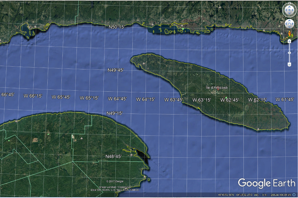 Québec, golfe Saint-Laurent, Côte-Nord, Minganie, île d'Anticosti, Gaspésie, image satellite générée par Google Earth 2017, Golfe_Anticosti_satellite_2017_950.