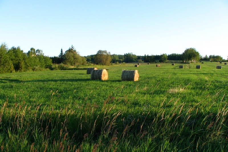 Abitibi-Ouest, île Nepawa, Clerval, mules de foin dans un champ, 06:31 le vendredi 5 août 2005,