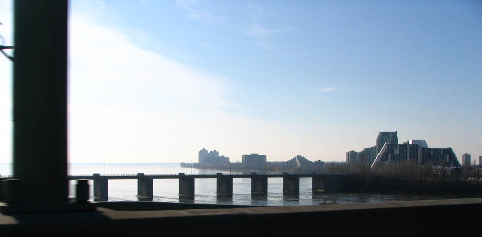 45° 28' 11" N - 073° 32' 08" O, Montréal, vue du pont Champlain, section alluviale du fleuve Saint-Laurent, la ville, le mercredi 22 novembre 2006. Photo Chantal Dubois, Pont_Champlain_007_950.