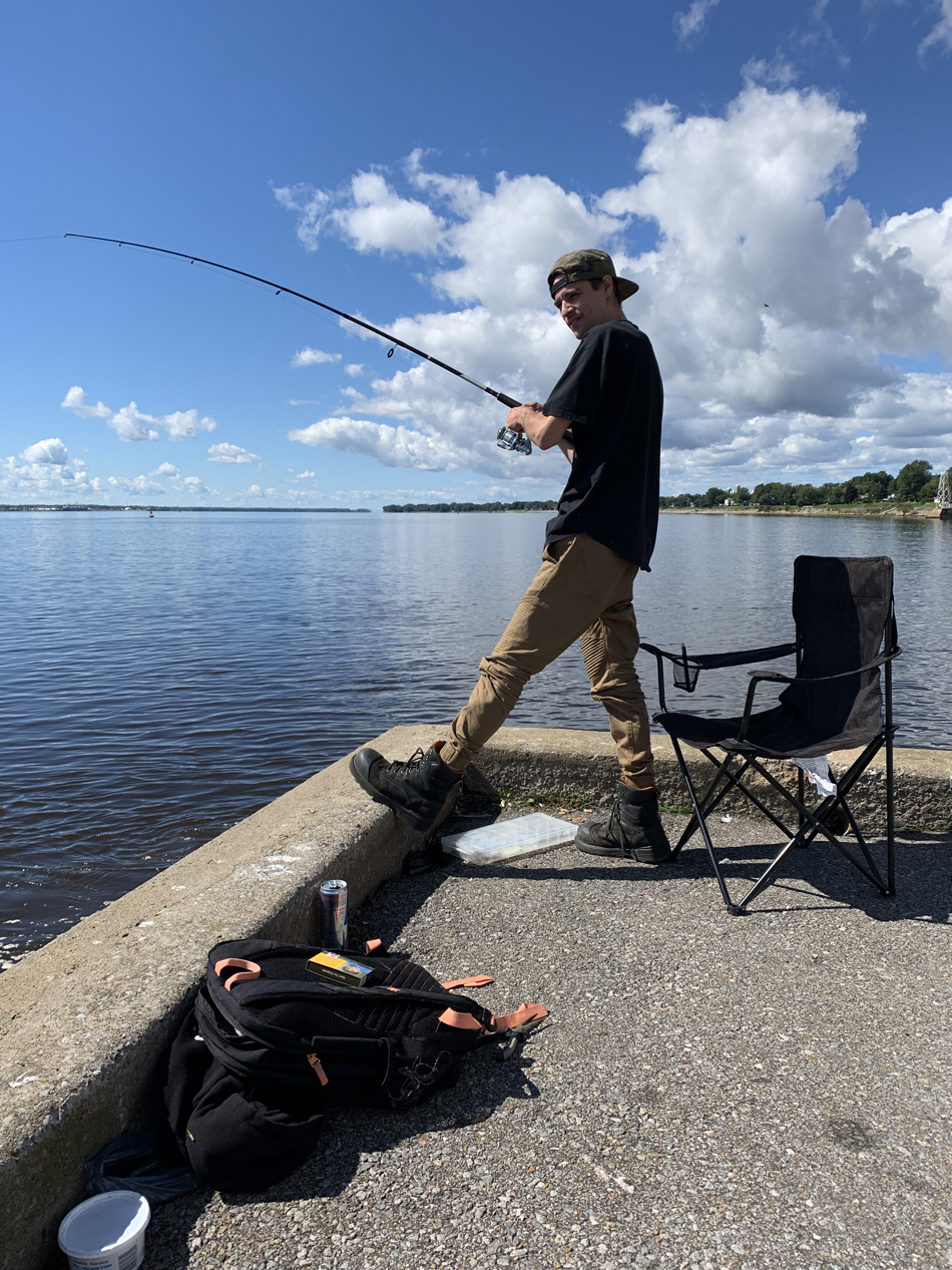 Fleuve Saint-Laurent, vers l'amont, pêcheur à la ligne non identifié,