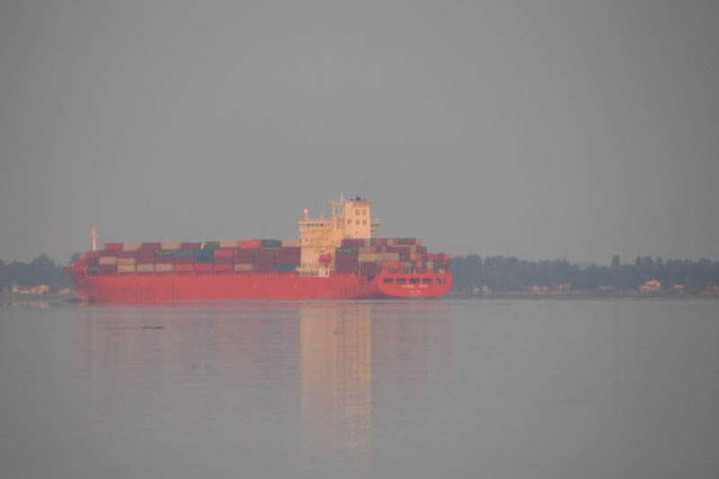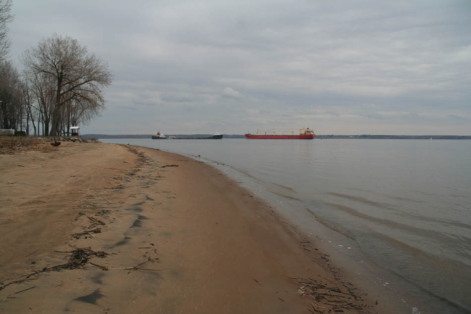 46° 26' 50.52" N - 072° 16 50.21" O, Mauricie, MRC Les Chenaux, Batiscan (Municipalité), plage de sable à l' embouchure de la rivière Champlain, navires dans le chenal de la section estuarienne du fleuve Saint-Laurent, le mercredi 22 avril 2009, photo Riviere_Champlain_020_950.