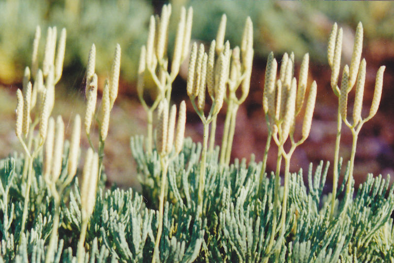 Tige profondément enfouie, émettant des rameaux aériens en forme de petits arbres, d'un vert bleuâtre et glauques ; ramifications ultimes produisant de nombreuses innovations qui donnent à la plante une apparence étagée, munies de 4 rangs de feuilles toutes semblables ; épis 4-5, sur de longs pédoncules, à maturité de bonne heure en août. Lieux sablonneux ouverts, bord des bois. Général, mais plutôt local. (Synonyme : L. chamaecyparissus A. Br.).