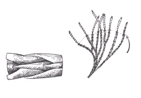 L. tristachyum, branche latérale montrant les innovations annuelles, à gauche, portion de rameau montrant la feuille ventrale non réduite.
