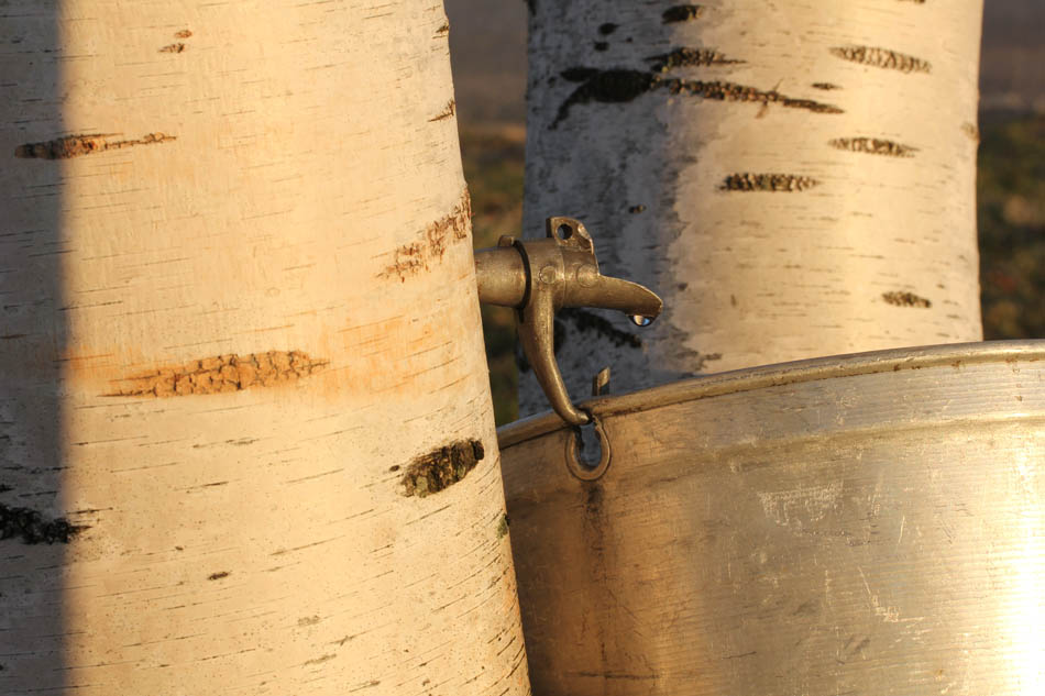 Rituel printanier : autour du 46º parallèle, après la saison de l'eau d'érable, fin avril jusqu'à la mi-mai, l'eau de bouleau coule abondamment. Selon plusieurs sources, elle possède des propriétés extraordinaires. Moins sucrée que l'eau d'érable, bonne à boire, j'en fais mon café, mes infusions, mes tisanes, j'en donne à tous ceux que je croise sur ma route !