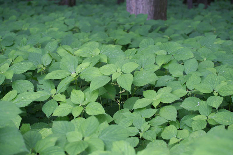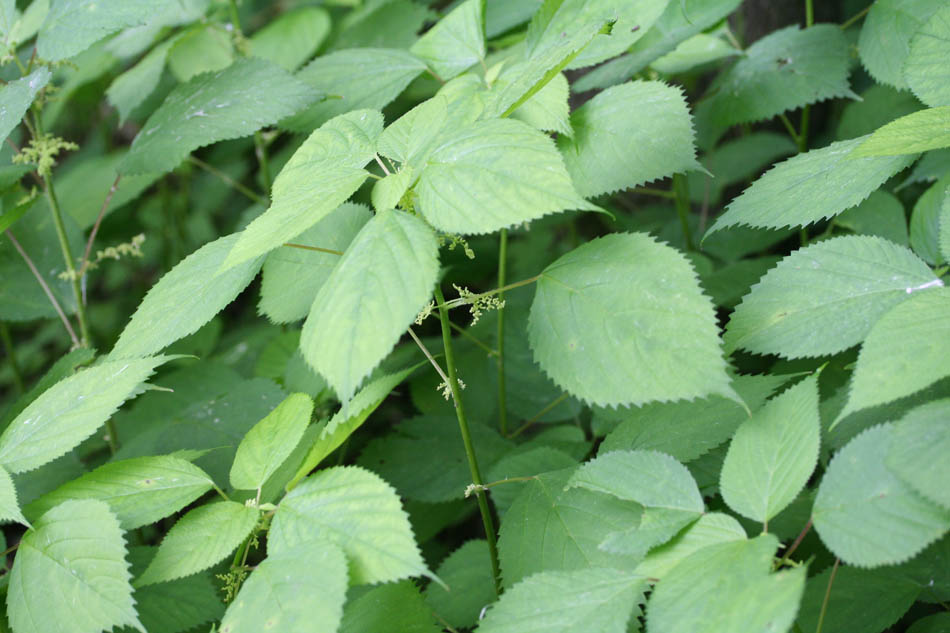 — Tige (longueur 60-120 cm) fortement armée de poils urticants ; feuilles très grandes (longueur 8-18 cm ; largeur 5-13 cm), ovées, fortement nervées ; inflorescence grande et laxiflore. Floraison estivale. Bois marécageux. Ouest et sud du Québec.