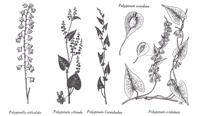 Polygonella : P. articulata, rameau florifère. — Polygonum : P. cilinode, sommité florifère et nœud cilié ; P. convolvulus, sommité florifère ; P. cristatum, rameaux fructifères et fruit ; P. scandens, fruit. Dessins du frère Alexandre Blouin.