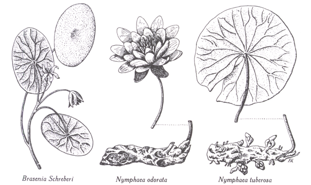 Brasenia : B. schreberi, rameau florifère. — Nymphaea : N. odorata, rhizome et fleur ; N. tuberosa, rhizome et feuille. Dessins du frère Alexandre Blouin.