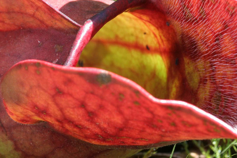 — Les sarracénies sont généralement considérées comme des plantes carnivores. Au point de vue morphologique, il faut considérer la partie creuse de la feuille comme un pétiole, l'opercule étant le véritable limbe. L'affinité des sarracénies et des nymphéas est remarquable. Les pétioles de ces derniers contiennent de grandes cavités revêtues de poils internes (trichomes). Dans les sarracénies, ces cavités semblent fusionnées en une seule où nous retrouvons les poils des nymphéas, mais qui cette fois ont une utilité apparente, celle d'empêcher l'évasion des insectes capturés.