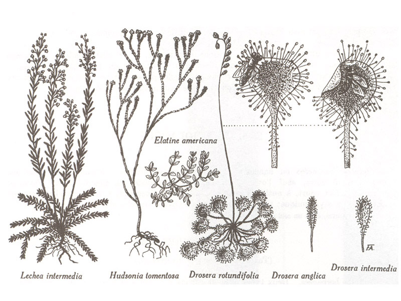 Lechea : L. intermedia, plante entière. — Hudsonia : H. tomentosa, plante entière. — Elatine : E. americana, plante entière. — Drosera : D. rotundifolia, plante entière, feuilles montrant l'adaptation au carnivorisme ; D. anglica, feuille ; D. intermedia, feuille.