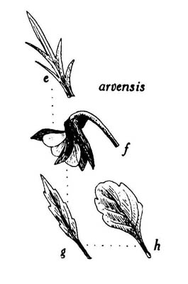 Viola arvensis, (e) stipule, (f) fleur, (g-h) feuilles.
