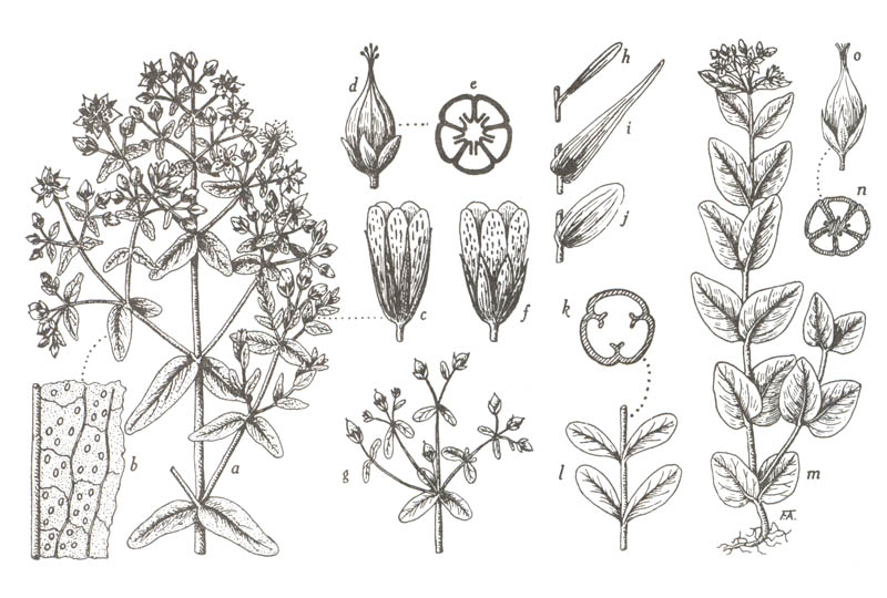 Hypericum : (a-c) H. perforatum, (a) sommité florifère, (b) fragment de feuille montrant les perforations ou « pertuis », (c) fleur ; (d-e) H. pyramidatum, (d) capsule, (e) coupe transversale de la capsule ; (f) H. punctatum, fleur ; (g) H. boreale, sommité fructifère ; (h) H. canadense, feuille ; (i) H. majus, feuille ; (j) H. mutilum, feuille ; (k-l) H. ellipticum, (k) coupe transversale de la capsule, (l) feuilles ; (m) H. virginicum, plante entière ; (n-o) H. kalmianum, (n) coupe transversale de la capsule, (o) capsule.