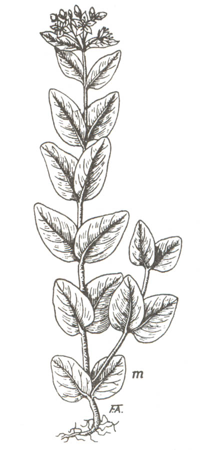— Plante glabre souvent rougeâtre ; tige (longueur 30-40 cm) ; feuilles (longueur 3-8 cm) oblongues-ovales, très obtuses ; fleurs (diamètre 12-15 mm) purpurines ou rosées ; capsule (longueur 8-10 mm) rouge pourpre. Floraison estivale. Lieux marécageux. Général.