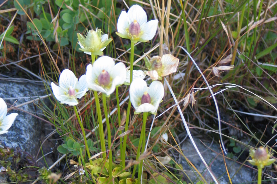 — Les glandes qui terminent les étamines stériles (staminodes) paraissent être des organes carnivores. Le liquide qu'elles sécrètent, toujours limpide, gluant et acide, n'est pas sucré. Les insectes visiteurs sont immédiatement englués et rapidement digérés. Cette particularité et d'autres suggèrent une affinité entre les Parnassia et les Drosera.