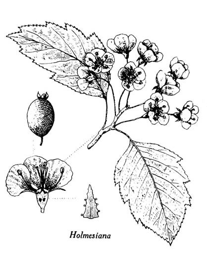 Clef des espèces ] oxyacantha ] crus-galli ] punctata ] suborbiculata ] acutiloba ] blandita ] crudelis ] flabellata ] matura ] pentandra ] congestiflora ] cognata ] densiflora ] fluviatilis ] [ holmesiana ] irrasa ] lenta ] anomala ] canadensis ] champlainensis ] submollis ] dilatata ] blanchardii ] brunetiana ] dodgei ] jackii ] jonesae ] lemingtonensis ] praecoqua ] rotundifolia ] affinis ] asperifolia ] knieskerniana ] scabrida ] aquilonaris ] conspicua ] dumicola ] ferentaria ] fertilis ] integriloba ] laurentiana ] macracantha ] rhombifolia ] succulenta ] victorinii ]