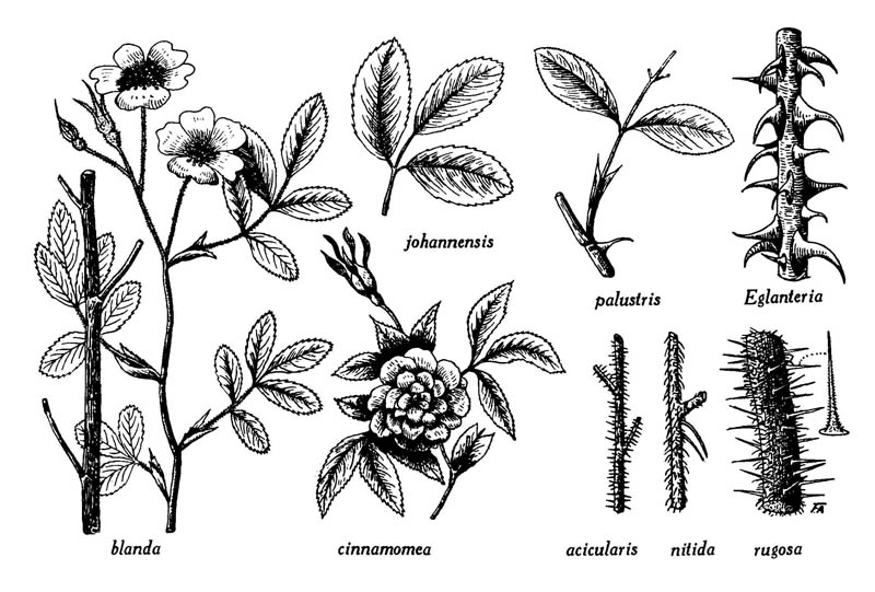 Rosa : R. blanda, rameau florifère et portion inférieure de la tige ; R. johannensis, feuille ; R. palustris, folioles, stipules et aiguillon infrastipulaire ; R. eglanteria, portion de la tige, avec aiguillons ; R. acicularis, portion de la tige, avec acicules ; R. cinnamomea, fleur (non décrit dans le manuel) ; R. nitida, portion de la tige, avec acicules et aiguillons infrastipulaires ; R. rugosa, portion de la tige, munie d'aiguillons et d'acicules, avec un aiguillon grossi.