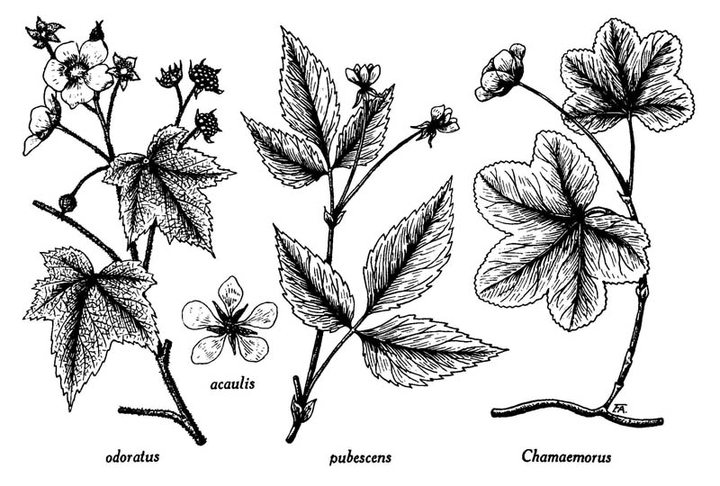 Rubus : R. odoratus, rameau florifère et fructifère ; R. acaulis, fleur ; R. pubescens, rameau florifère ; R. chamaemorus, plante entière.