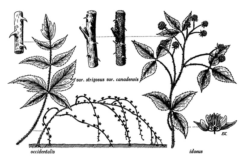Rubus : R. occidentalis, schéma de la plante entière à la feuillaison, feuille, portion de la tige ; R. idaeus, rameau fructifère, fleur, portions de tiges des deux variétés.
