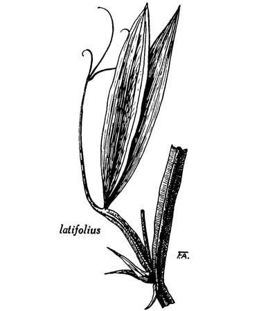 — Plante vivace à très gros rhizome ; tige (longueur 100 cm et plus) grimpante, largement ailée ; feuilles portant une seule paire de folioles oblongues-lancéolées ou elliptiques, fortement nervées ; fleurs (longueur 20-25 mm) pourpres ou blanches, en grappe dépassant les feuilles. Floraison estivale. Cultivé pour l'ornement et s'échappant parfois le long des chemins où il forme d'épais rideaux sur les clôtures.