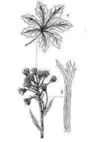 Petasites palmatus, sommité florifère, (a) feuille basilaire, (b) feuille caulinaire médiane