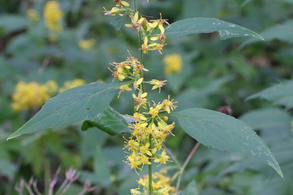 Tige (longueur 30-100 cm) en zigzag ; feuilles minces, ovées, dentées, pétiolées ; capitules (longueur 5-6 mm) réunis en fascicules axillaires, ou en grappes axillaires courtes ; rayons 3-4. Floraison estivale-automnale. Bois riches. Général dans le Québec. (Synonyme : S. latifolia Linné).