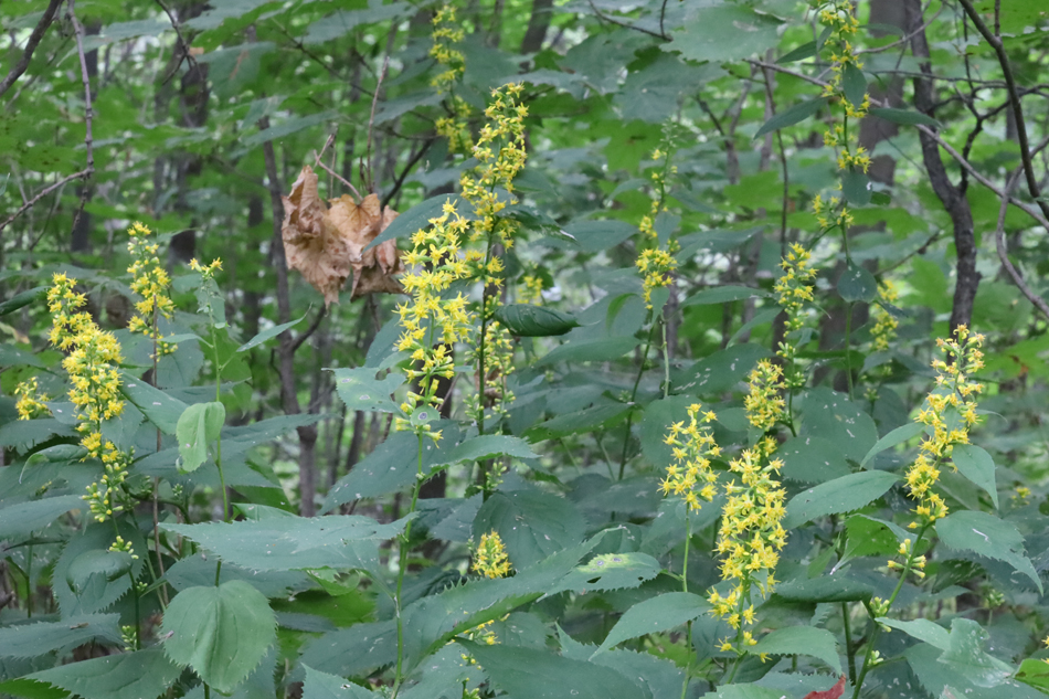 Solidago flexicaulis Linné. 46° 35' 11.2" N - 072° 03' 41.3" O, Capitale-Nationale, MRC Portneuf, Deschambault-Grondines (Municipalité), Grondines (Secteur), terre inondable, bordure du fleuve Saint-Laurent, domaine Daniel et Réjean Trottier, 0646 le samedi 28 août 2021, Solidago_flexicaulis_021_950_633.