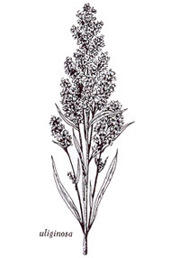 Tige (longueur 15-200 cm) glabre, forte et simple ; feuilles oblongues-lancéolées, glabres, fermes, aiguës ou acuminées, les basilaires (longueur 10-25 cm) ; capitules (longueur 4-6 mm) formant une thyrse terminale oblongue et dense, à branches fortement apprimées ; bractées linéaires-oblongues, obtuses ; achaines glabres. Floraison automnale. Lieux humides au nord du Québec, et tourbières au sud. Général dans le Québec.