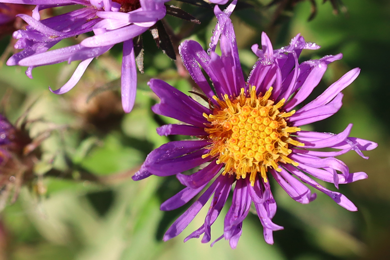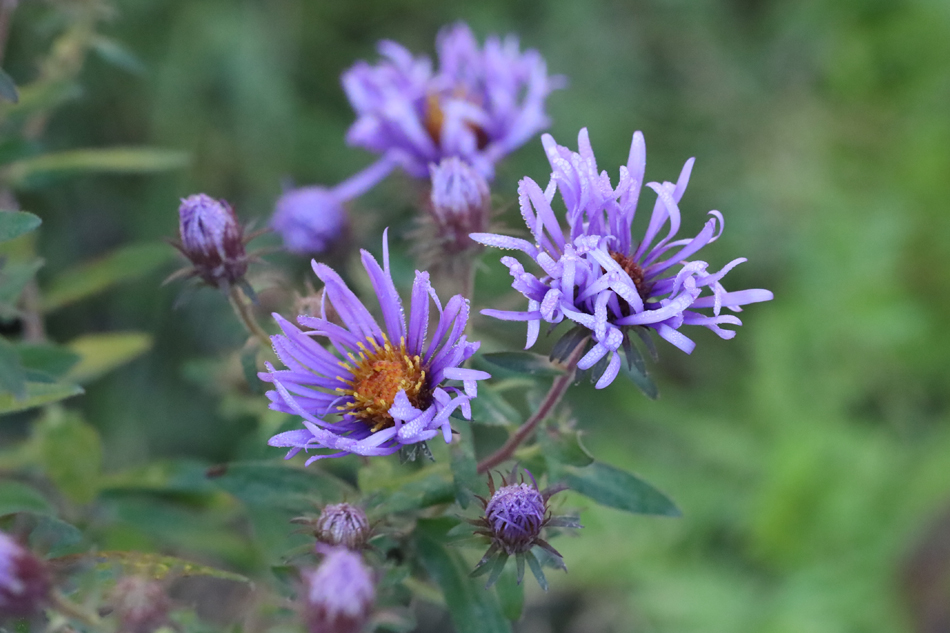 Tige (longueur 50-150 cm) hispide, très feuillée ; feuilles lancéolées, entières, à base embrassante ; capitules (diamètre 35-50 mm) à rayons nombreux (40-50), très finement linéaires, d'un beau violet ; involucre glanduleux-velu. Floraison automnale. Champs secs. Ouest du Québec seulement.