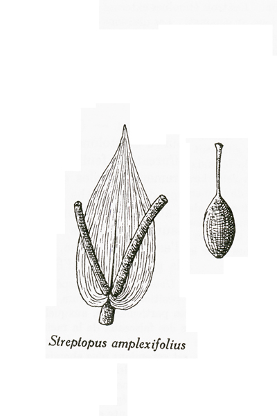 1. Streptopus amplexifolius (Linné) A. P. de Candolle. — Streptope amplexicaule. — (Clasping-leaved Streptopus).