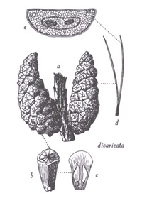 Pinus divaricata, (a) cônes, (b) face dorsale d'une écaille, (c) graines sur face ventrale d'une écaille, (d) feuilles, (e) coupe transversale d'une feuille.