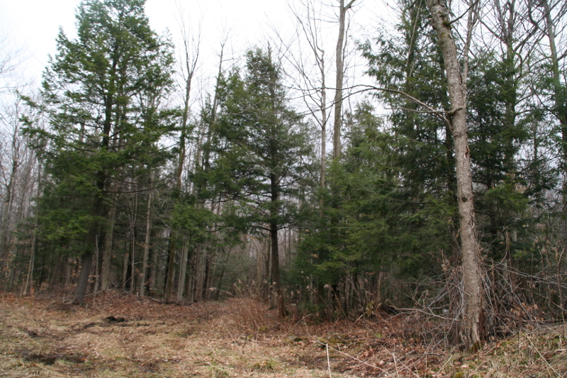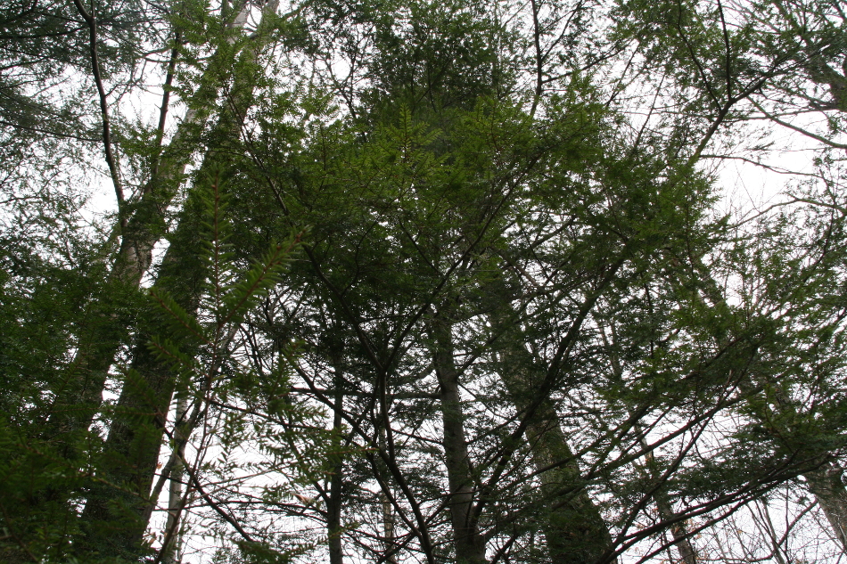 Tsuga canadensis (Linné) Carrière, cymes d'arbres matures. 45° 14' 41.4" N - 073° 18' 21.2" O, Montérégie, MRC Le Haut-Richelieu, Saint-Jean-sur-Richelieu (Ville), chemin Petit-Bernier, érablière Au pain de sucre, 12:17 le vendredi 9 avril 2010, Tsuga_canadensis_010_800.