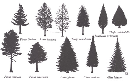 Silhouettes des gymnospermes arborescentes du Québec. Dessins du frère Alexandre Blouin.