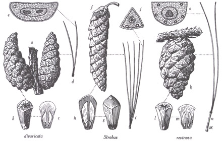 resinosa, (k) cône, (1) face dorsale d'une écaille, (m) graines sur face