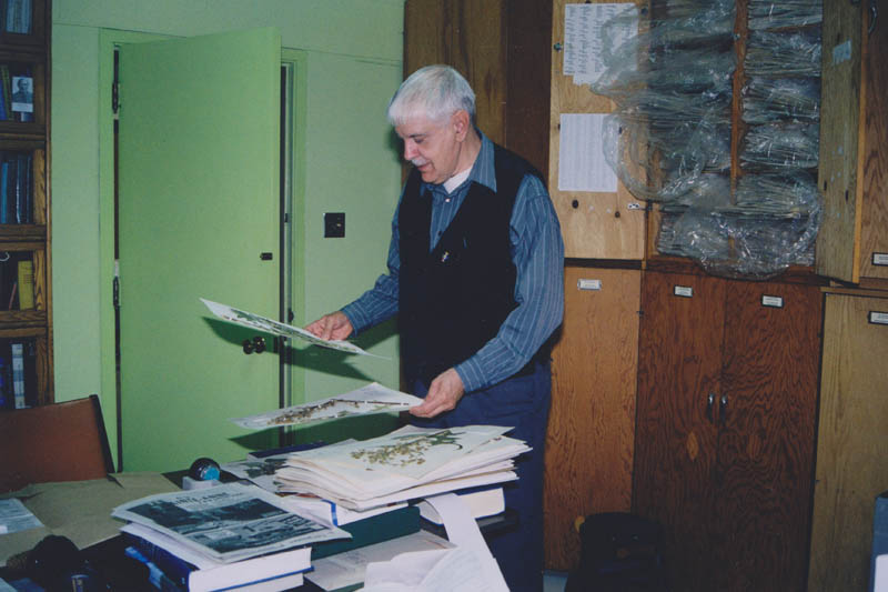 dans son bureau, Marcel Blondeau identifie mes spécimens séchés de plantes, en comparant avec les spécimens de son herbier, le jeudi 26 octobre 2000, photo 001026_3_800.