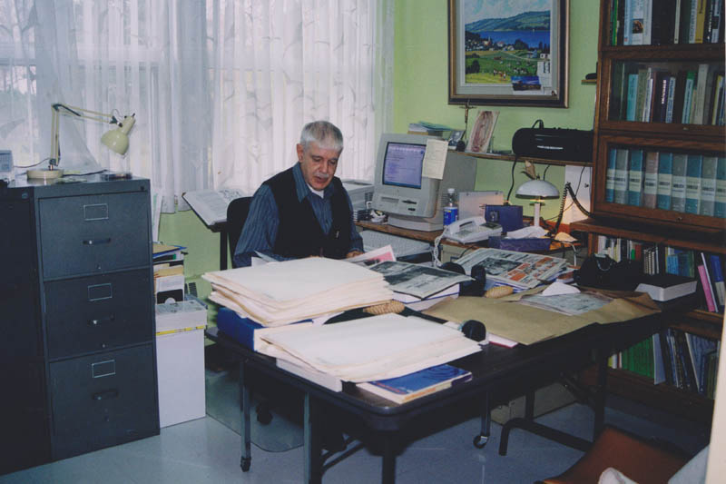 dans son bureau, Marcel Blondeau identifie mes spécimens de plantes séchées, en comparant avec les spécimens de son herbier, le jeudi 26 octobre 2000, photo 001026_2_800.