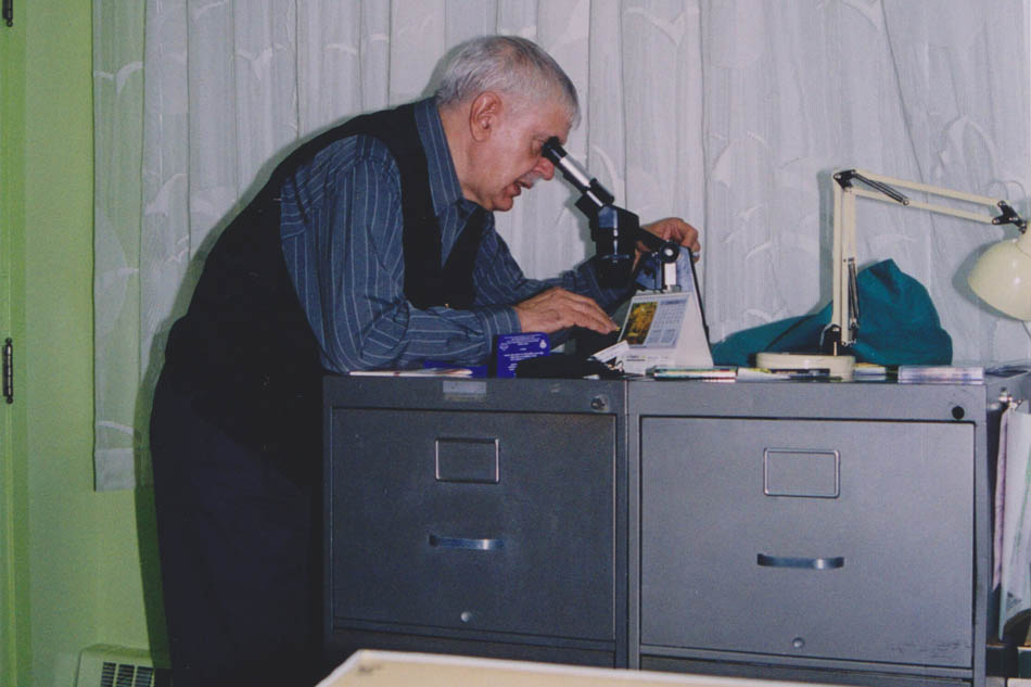 dans son bureau, Marcel Blondeau examine, au binoculaire, un spécimen de plante séchée afin de l'identifier avec rigueur, le jeudi 26 octobre 2000, photo 20001026_4_950.