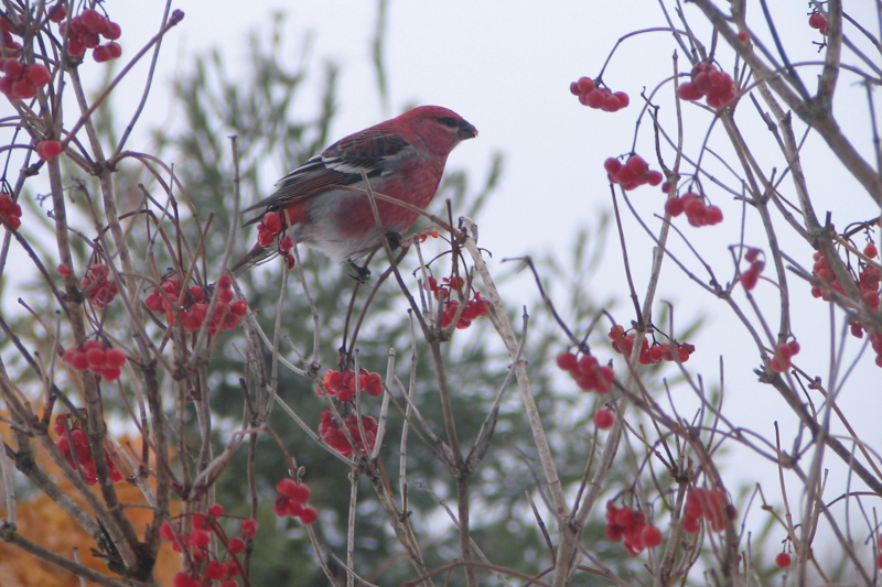 Viburnum trilobum Marshall. — Viorne trilobée. — Pimbina, dans l'ouest et le centre du Québec. — (Cranberry tree). Femelle et mâle : — Pinicola enucleator. — Durbec des pins. — (Pine grosbeak). Mauricie, MRC Les Chenaux, Saint-Prosper-de-Champlain, 1er rang Saint-Édouard, 14:59 le mercredi 21 novembre 2007, Viburnum_trilobum_020_800.